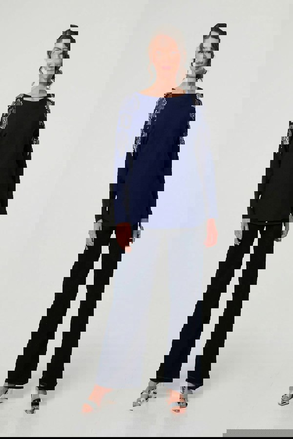 This sparkly top is perfect for bringing shimmer to your workdays and your weekends. It has a relaxed fit, a thigh length hem and long sleeves. The sparkly details on the shoulders add a beautiful finishing touch.