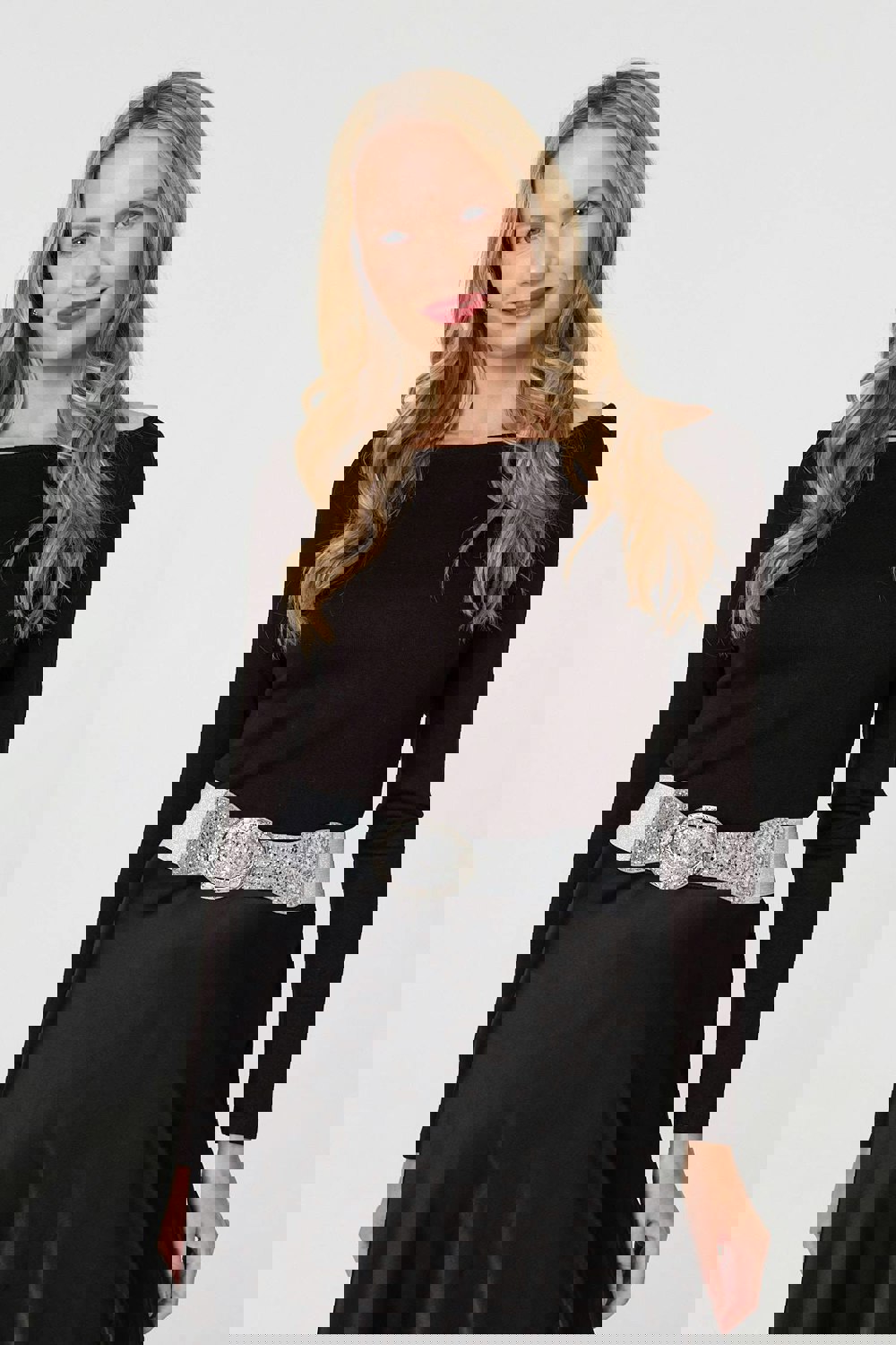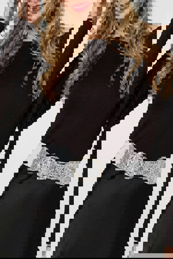 Looking to add some extra sparkle to your outfit? This belt is perfect. It has eye-catching glittery details, along with a diamante embellished buckle. Style this belt for evenings out over your favourite black midi dress to let those shimmery details shine.