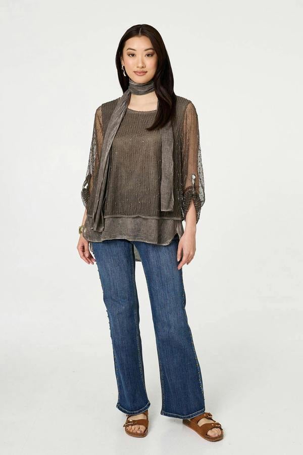Get a boho-inspired look in this beautiful long sleeve top. It's made from semi sheer layered materials and has a ruffled hem, giving the illusion of multiple tops layered on top of each other. It also comes with a matching scarf! This top is finished with elegant sparkles and has turn-up sleeves for a relaxed look.