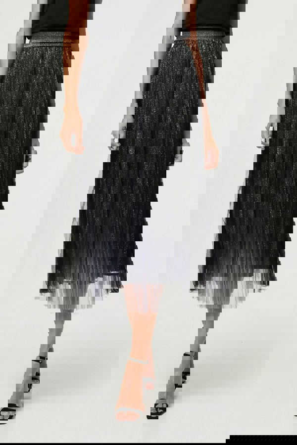 Dress for a special occasion in this eye-catching skirt, complete with beautiful glittery mesh. It has an elasticated high waist, pleats and a layered shape. The midi length hem means this skirt looks elegant with ankle boots or heels.