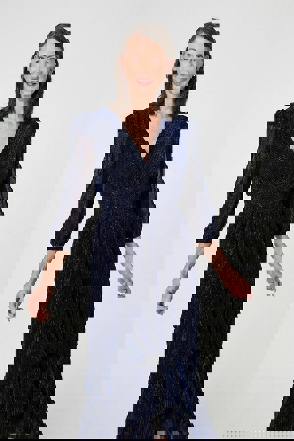 At your next special occasion or formal event, this maxi dress is the perfect outfit option. It's made from semi sheer mesh materials with a shimmery, sparkly finish; and it has 3/4 puff sleeves, a v-neck and a tiered shape. Wear it with heels and a clutch bag.