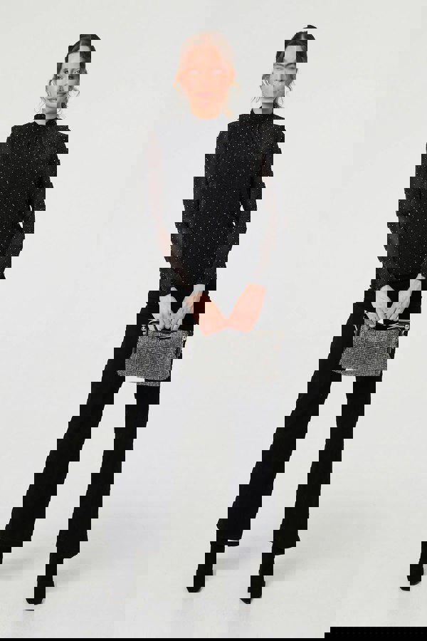 This sparkly top is finished with shimmery embellishments and a semi sheer mesh layer. It has a flattering ruched high neck, long sleeves and a slim fit. Dress for an evening out in style by pairing this top with a faux leather midi skirt, or your favourite smart jeans.