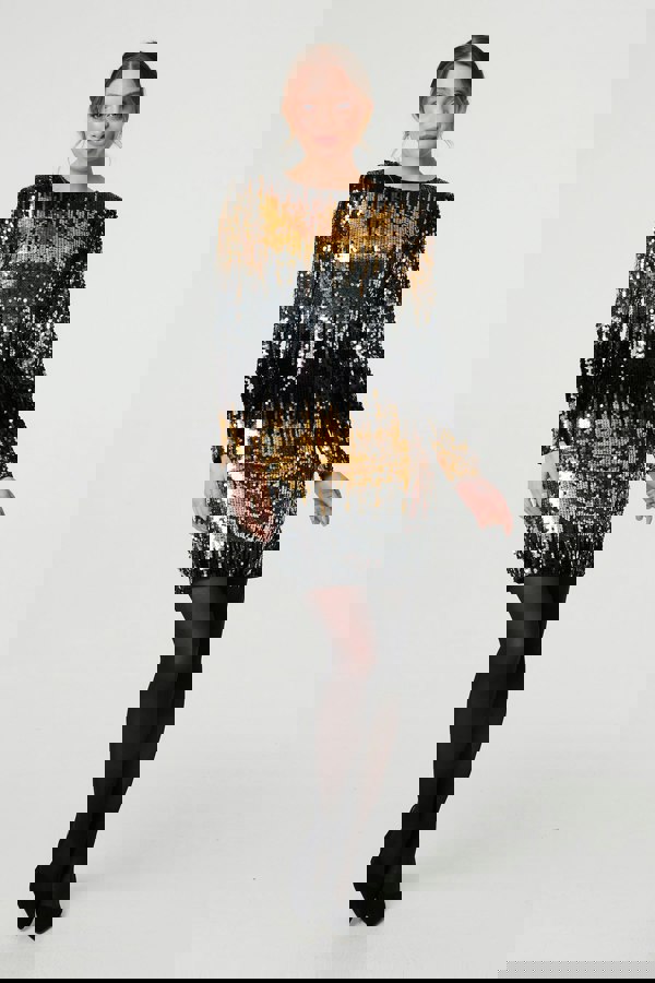 Cut in a classic shift silhouette, it features a round neckline, long sleeves and a mini-length hem, creating a balanced and flattering shape for all figures. Perfect for parties, celebrations and special occasions, simply style it with tights and heels for a confident, show-stopping look.