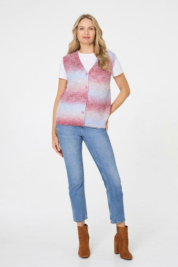 Add some extra warmth - and some extra sparkle! - with this simple vest. It's made from a comfortable knit material and has a v-neck, buttons and a boxy fit. Wear it with any outfit that could use some shimmer.