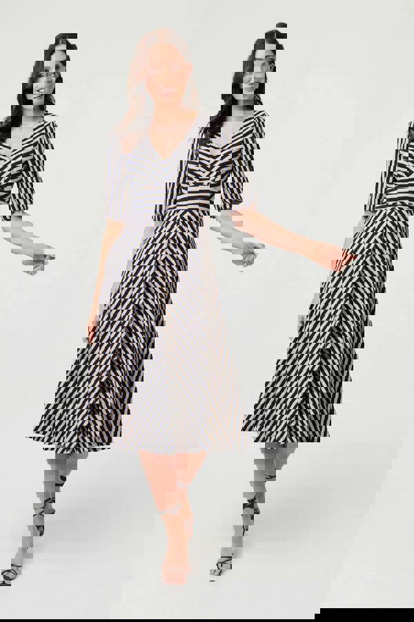 This beautiful dress offers a flattering fit for all figures, thanks to a classic a-line shape and a cinched waist. It features beautiful 1/2 puff sleeves, a v-neck and pockets. Pair this midi dress with your favourite heels for an evening out.