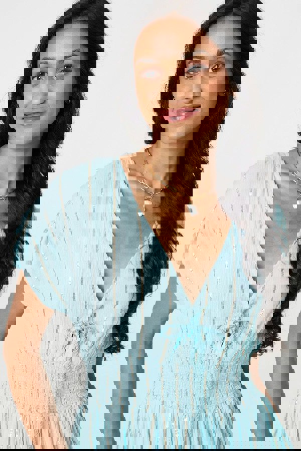 Every summer wardrobe needs this maxi dress. It has a deep v-neck with a tassel tie front and cap sleeves. The empire waist has a shirred panel for a flattering effect too. Plus it even has pockets! Style this dress with sandals on a hot day.