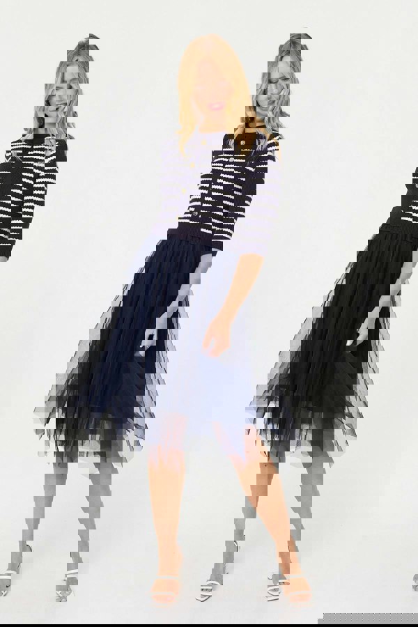 This beautiful dress is designed to look like a knit cardigan and a skirt in one easy dress. It features a striped top, complete with a slim fit, button details and 3/4 sleeves. The skirt flares from the waist with eye-catching mesh and features a hanky hem that reaches midi length. Wear this elegant dress with heels for an evening out.