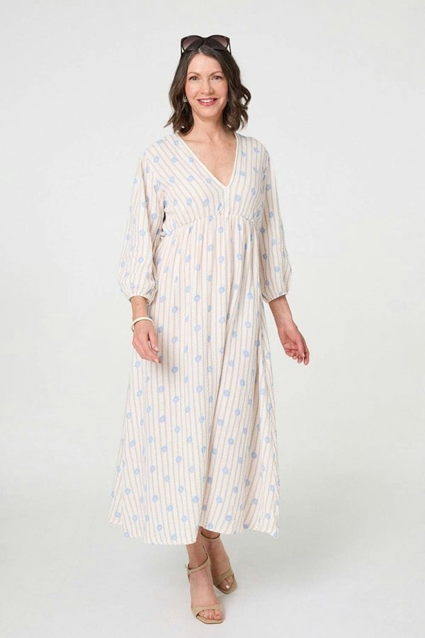 Dress for a sunny day in style with this laid-back maxi dress. It has an empire waist with a v-neck and long sleeves. The open back fastens with a tie detail for the perfect fit too. Wear it with simple white trainers for effortless summer style.