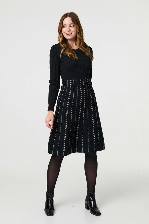 Add an effortlessly chic knitted dress to your cold weather wardrobe with this striped knit midi dress. With a v-neck, long sleeves, a ribbed knit bodice and a contrast striped midi skirt. Style with tights and knee high boots for a chic office outfit.