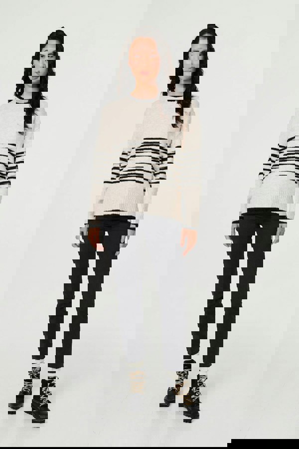 Add this comfortable jumper to your autumn wardrobe. It has long sleeves with drop shoulders, a round neck, and a hip length hem. It layers elegantly over trousers or a skirt.