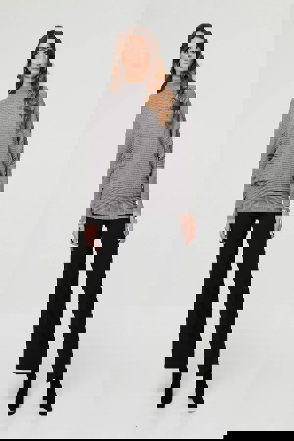 This simple-yet-stylish jumper is finished with a striped textured look. It has a high neck, long batwing sleeves and a slim fit. The hip length hem layers perfectly over a skirt, jeans or smart trousers for a special occasion.