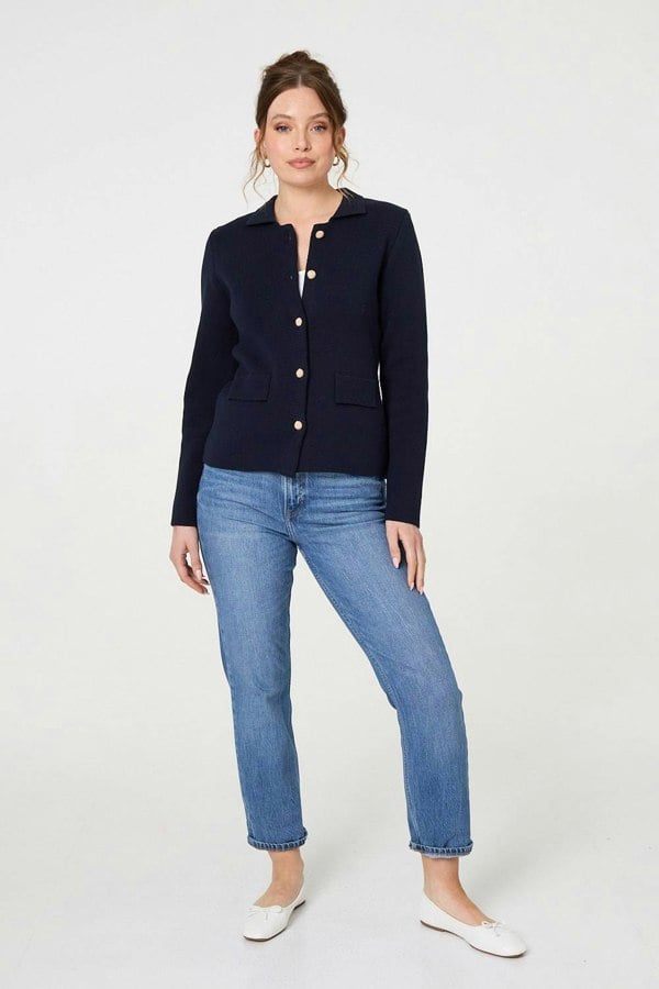 Go for a timeless smart look with this knitted jacket. It's made from a textured knit material and has a classic fitted shape that will suit all body types. Fasten the front with the embellished buttons, or leave it open over your favourite blouse for a formal, professional finish. It also has long sleeves, a collar and pockets on the front.