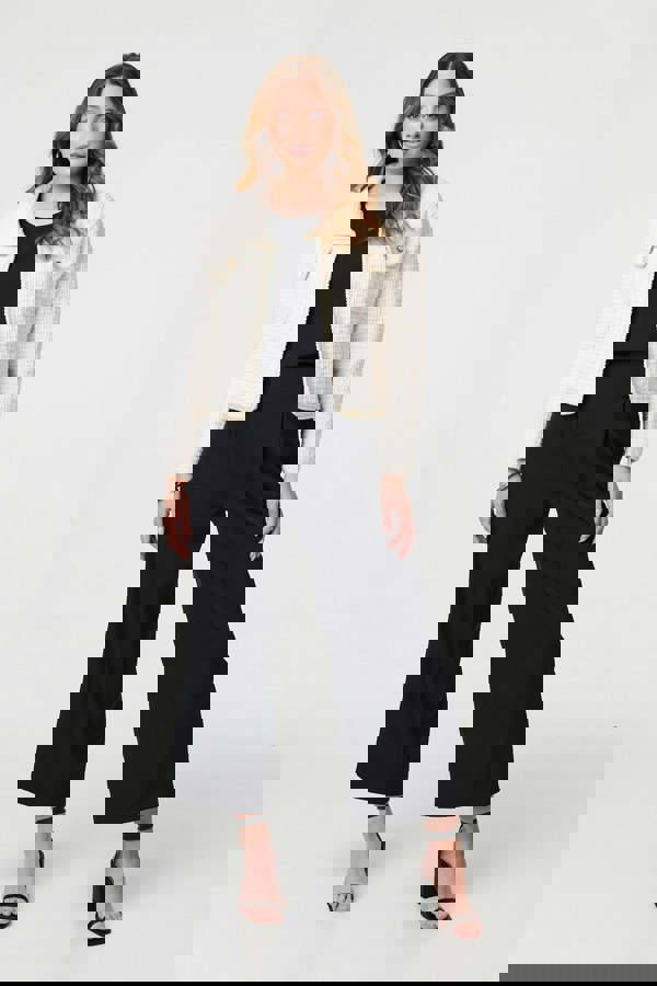 Add an extra layer with this comfortable knit jacket. It has elegant pocket details, complete with shiny buttons - as well as a formal collar. The boxy fit and cropped hem means it looks sleek paired with any high waist skirt or trousers.