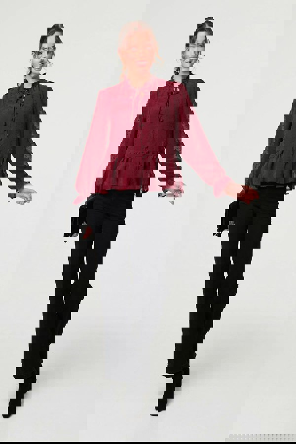 Dress for work or smart events in this beautiful blouse. It's made from a textured semi sheer fabric, with a layered look and frilled details. The high neck fastens with a delicate tie, and the long sleeves have a slightly puffed shape. Style with smart trousers or a midi skirt.