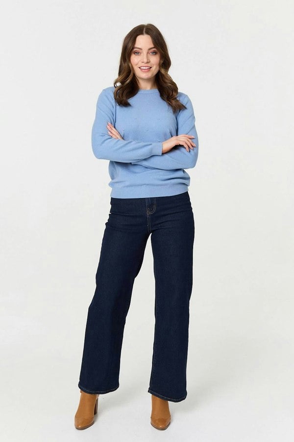 This textured knit jumper is a must-have for your transitional wardrobe. It has long sleeves, a round neck and a hip length hem. Wear it as a warming layer over any casual or professional outfit.