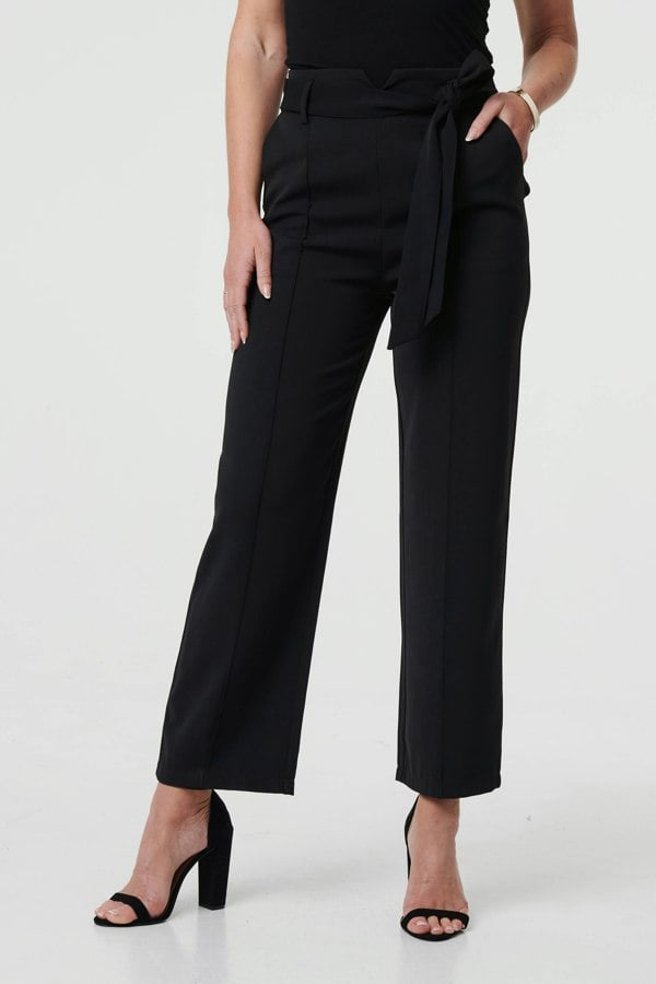 Dress for smart occasions in style with these high waist trousers. They feature a flattering tie front, belt loops, and a straight leg fit. Plus they even have pockets! Wear them with a smart blouse for a special occasion or a day at work.
