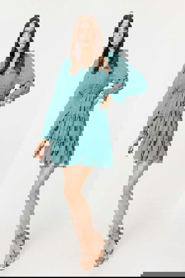 Heading out for a romantic date night or a few fun cocktails with the girls? This mini dress is perfect. It has floaty long puff sleeves with a semi sheer layer, an empire waist, a v-neck and a short length hem with frill details.