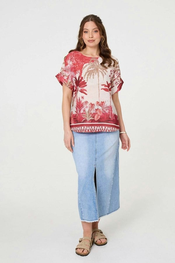 When it comes to comfort and style, you can't go wrong with a simple t-shirt. This one has turn-up 1/2 sleeves, a scoop neck and a relaxed fit. The hip length curved hem will give you extra coverage, whether you're wearing trousers or a skirt.