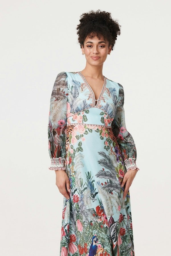 This beautiful midi dress is perfect for your next wedding or other special occasion. It has a flattering v-neck and an empire waist - as well as long puff sleeves. The dainty button detail on the bust will add modesty and an extra special finishing touch. Complete the look with a clutch bag and heels.