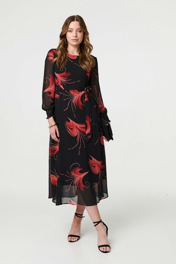 Dress up in style with this formal dress. It has an elegant semi sheer mesh layer and long puff sleeves, with a round neck and a midi length hem. It will flatter all figures thanks to a waist tie and an a-line fit. Style with black heels to your next smart event - whether that's a wedding, party or a formal dinner date.