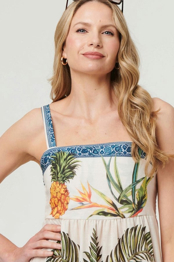 Get ready for the summer in this stunning midi dress. It has wide straps for extra comfort, so you can even wear your regular strapped bra underneath. It features a square neck, an empire waist, and an a-line skirt. Style with your favourite gladiator sandals to turn the walk to work into a walk along the beach.