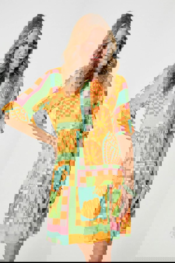 Add an effortlessly bold tropical printed dress to your collection with this smock dress. With a round neck, short frilled sleeves, a loose fit and a tiered knee length skirt. Style with strappy sandals and a denim jacket for a casual daytime holiday outfit.