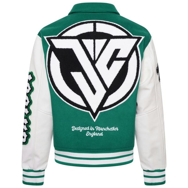 Step up your style game with the J Varsity Jacket, a perfect blend of classic design and modern flair. This jacket features a striking combination of green sleeves and a white torso, accented with green and white striped cuffs. The standout patches and embroidery, including the bold letter ‘JC’ and the numbers ‘1243’, add a personalized touch that celebrates school spirit and individual achievement.