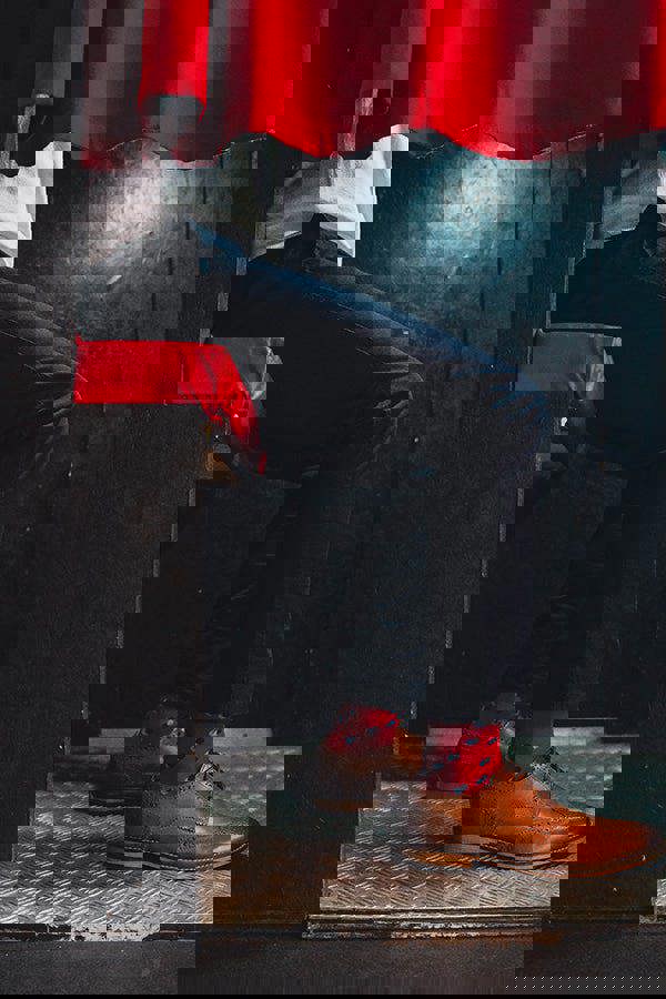 Person wearing brown shoes with red spot socks and dark pants peeking from behind a red curtain.