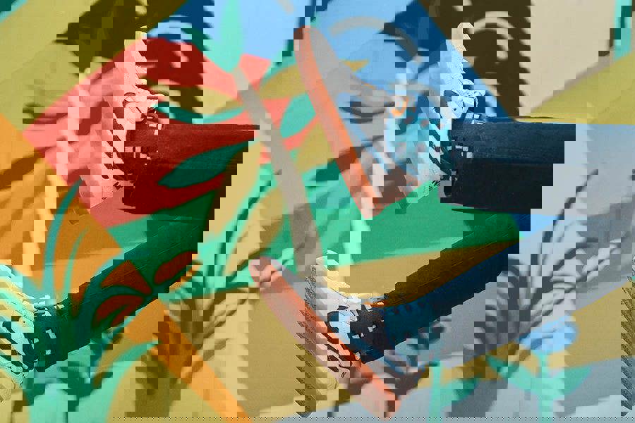 Person wearing nike sneakers against a colorful abstract wall with geometric design mens socks
