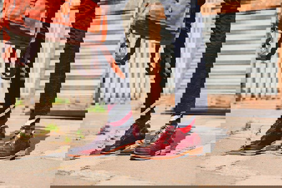 Person wearing red leather shoes with striped socks, standing on a pavement.