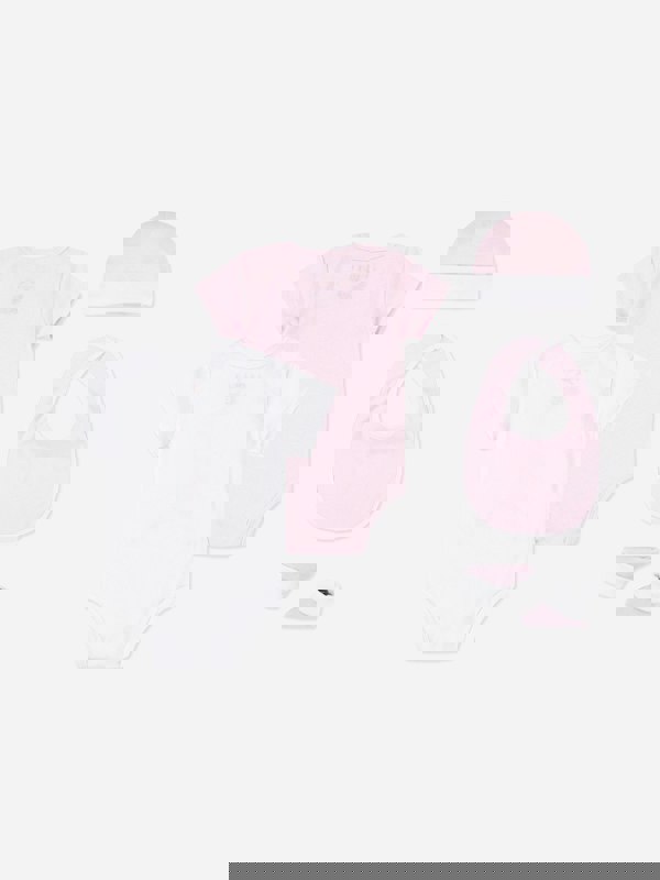 This Jordan baby girls bodysuit gift set includes five pieces in pink. The set contains five bodysuits, offering multiple options within one pack.