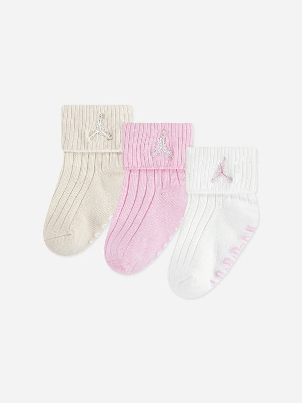 The Jordan Kids Essential 3 Pack Ribbed Gripper Socks Set in pink adds a practical option to everyday outfits. This set includes three pairs, finished in a vibrant pink tone. Ribbed texture runs through the design, paired with grip enhancements for added traction.