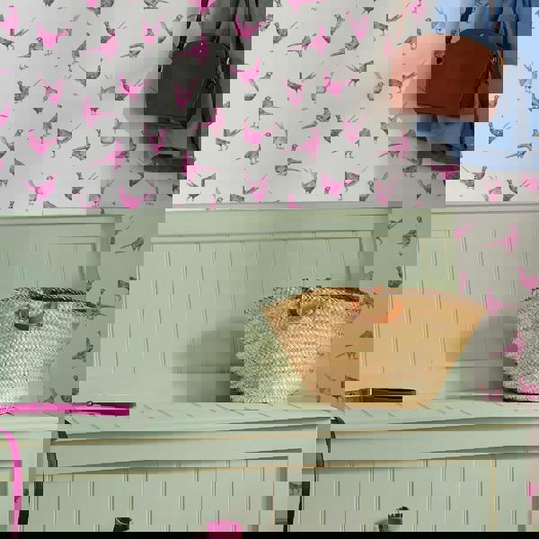 Fabulously flirty and pretty in pink, these pheasants dance across a white background to create a fun and funky pattern. Game bird wallpaper is often a feature of traditional country homes, but you've never seen birds quite like this! This pheasant wallpaper has bright pink pheasants cheerfully strutting around a neutral background. The pink adds a bold pop of colour and is bound to be a talking point with your guests. Whether in a muddy boot room or as a feature wall in a kitchen, this Paste-The-Wall pheasant wallpaper is easy to apply, tough enough to cope with everyday life and a dash of fun in any space.