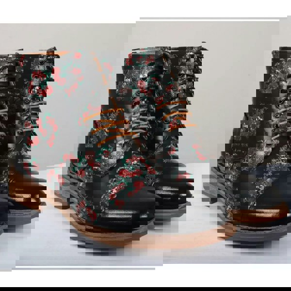 Justin Reess brings a distinctive edge to smart footwear with the Adam men’s Oxford boots. Finished in black leather with a floral skull print, this ankle-boot silhouette balances statement detailing with a clean, dress-boot profile. The sleek leather construction gives the pair a polished look, while the lace-up fastening keeps the fit adjustable for day-to-evening wear.
