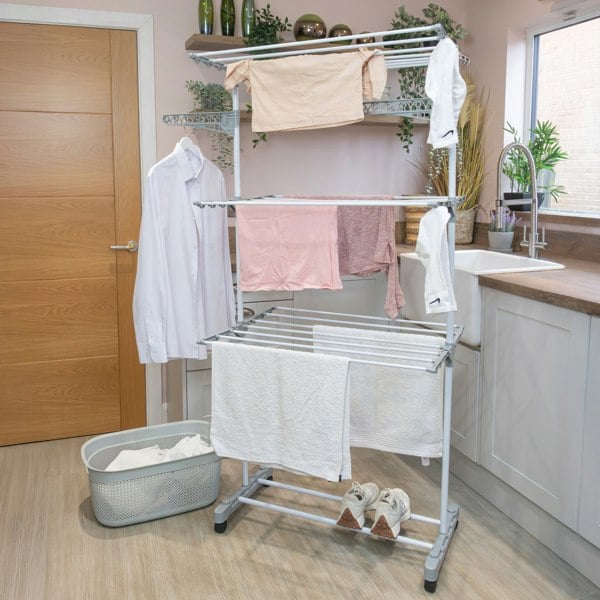 3 tier drying rack provides 21 metres of drying space and 23 bars for hanging laundry of all sizes