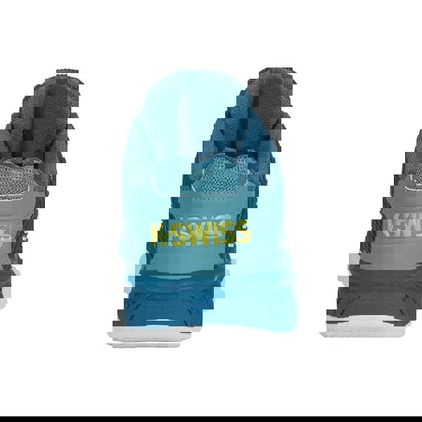 K-Swiss Hypercourt Express 2 tennis trainers for children in blue, made with a faux leather upper. The low-cut shape and flat sole are finished with a lace-up fastening through 12 eyelets. A contrast panel and logo detail complete the look, with a round toe for a classic trainer profile.