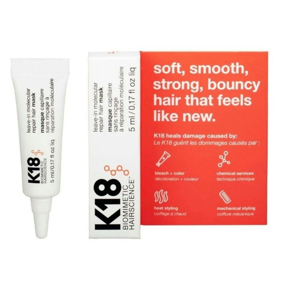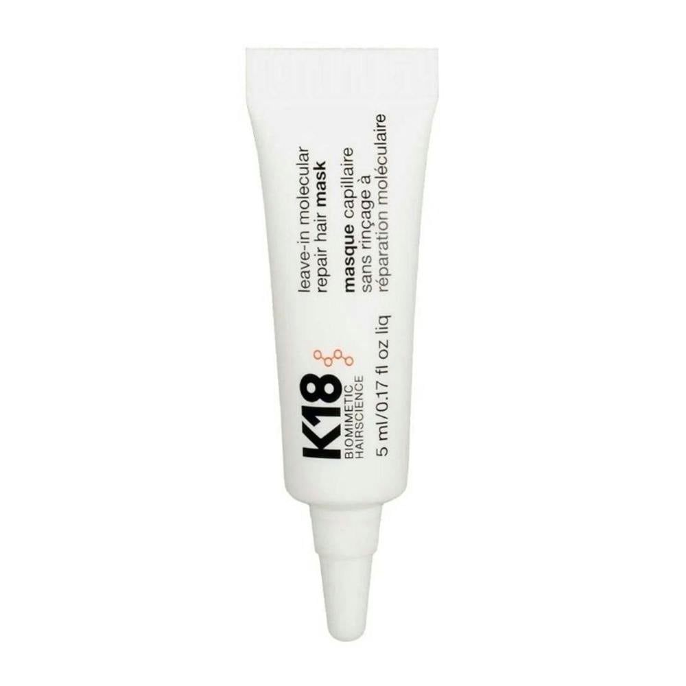 Discover the mini K18 Leave-In Molecular Repair Hair Mask 5ml, for strengthened, moisturised hair with improved elasticity.