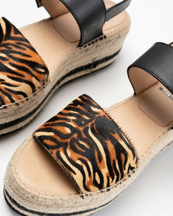 Flatform espadrille style sandals with a large buckle and tiger print detail.