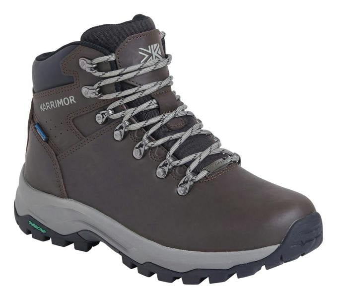 Karrimor Mendip 4 Womens Waterproof Hiking Trekking Ankle Boots, sturdy brown waterproof ankle boots with grey laces and rugged outsole for outdoor hiking.