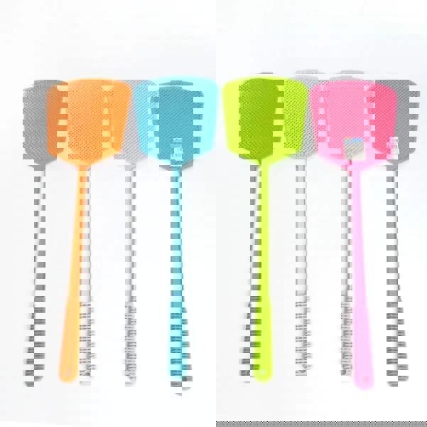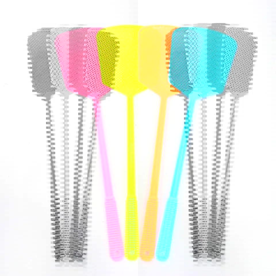 Pack of 6 fly swatters. Durable, eco-friendly, and safe for use around children and pets. Long handle and large head for maximum reach and effective swatting.