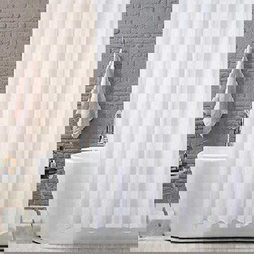 Ready-to-hang white polyester shower curtain. Soft, durable, and machine washable. Includes hooks for easy installation.