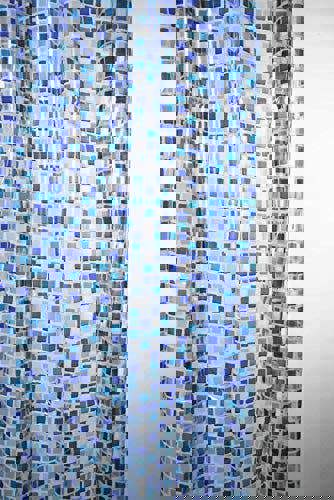 Blue and white PEVA shower curtain. Waterproof and easy to clean. Comes with hooks for simple installation.