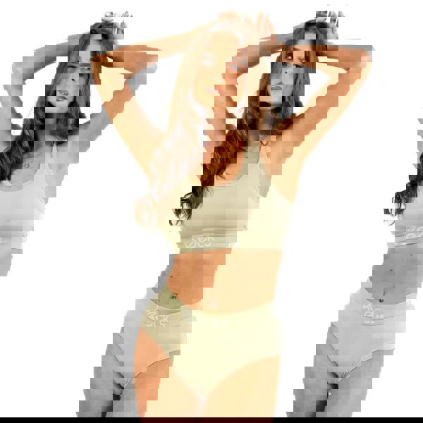 Racerback straps create a secure, casual fit, while the branded waistband brings a clean, sporty finish. Seamless stitching helps minimise discomfort, and the anti-roll waistband keeps the bralette in place whether you are practising light yoga, relaxing at home or heading out for errands.