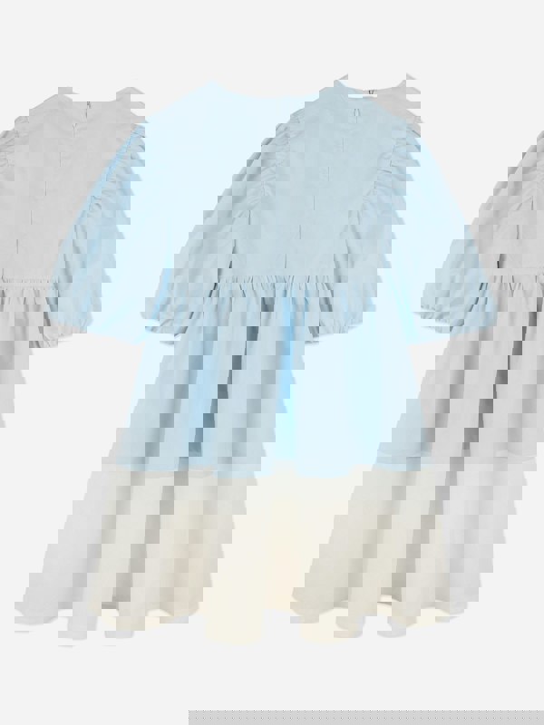 This girls’ pale blue cotton poplin dress brings a modern look with Japanese abstract influence. The bi-colour design keeps the finish clean and graphic, while gathers add shape through the skirt. A round neck and elasticated sleeves complete the silhouette, with an invisible zip at the back for a neat closure.