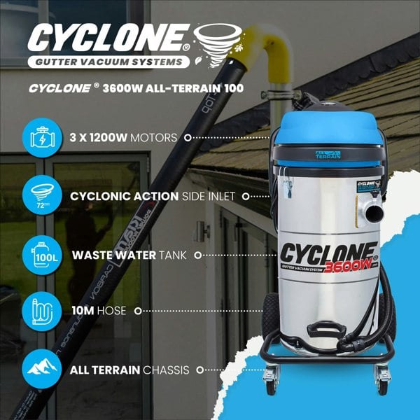 Meet the flagship 100L drum with a 72mm cyclonic side inlet and 3 × 1200W motors (3600W). The All-Terrain chassis adds industrial wheels, a full steel frame, and dual front brakes for control over rough ground.