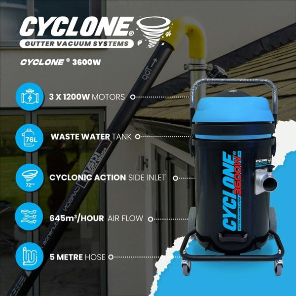 Pro-grade gutter clearance with a 76L drum, 72mm cyclonic side inlet, and triple 1200W motors (3600W). Cyclonic airflow drops debris to the base for smoother suction and fewer clogs. This is the Standard chassis version with robust workshop-friendly castors.