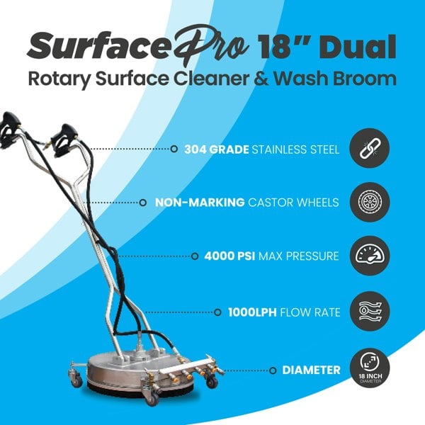 Professional-grade 18" / 460mm rotary surface cleaner with dual trigger design, integrated wash broom, and side jets. Perfect for block paving, patios, driveways, and industrial flooring. Built for professionals who demand speed, efficiency, and outstanding cleaning results.