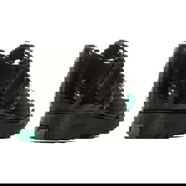 Kickers Girls Fragma T-bar shoes in black patent leather with a low-cut profile and low heel. The round toe and plain finish sit alongside embossed detailing and a logo. Triple stitching adds a defined look across the upper, while the touch fastening strap secures the T-bar shape.