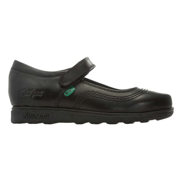Kickers Fragma Pop school shoes in black with a plain finish and logo detail. The upper is leather, with a textile lining and a synthetic insole and midsole. A padded collar and embossed detailing complete the look, while the triple hook and loop straps provide a secure fastening.