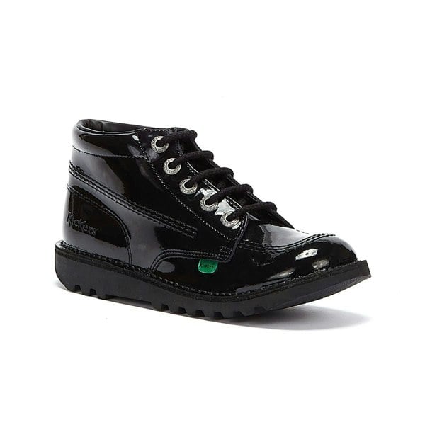 Own a piece of footwear history with these black patent Kickers. Features include the iconic red and green tabs, chunky cleated sole and triple stitch detailing. Quality leather uppers ensure all-day comfort.